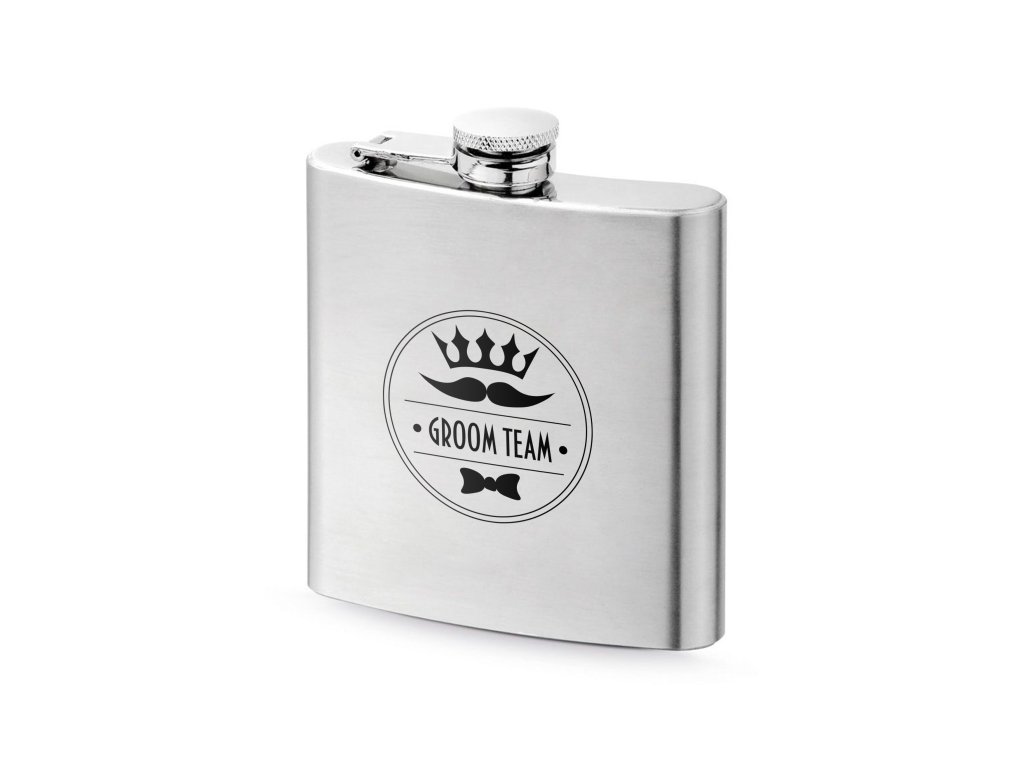 - nerezová placatka s gravírovaným motivem „Groom Team“