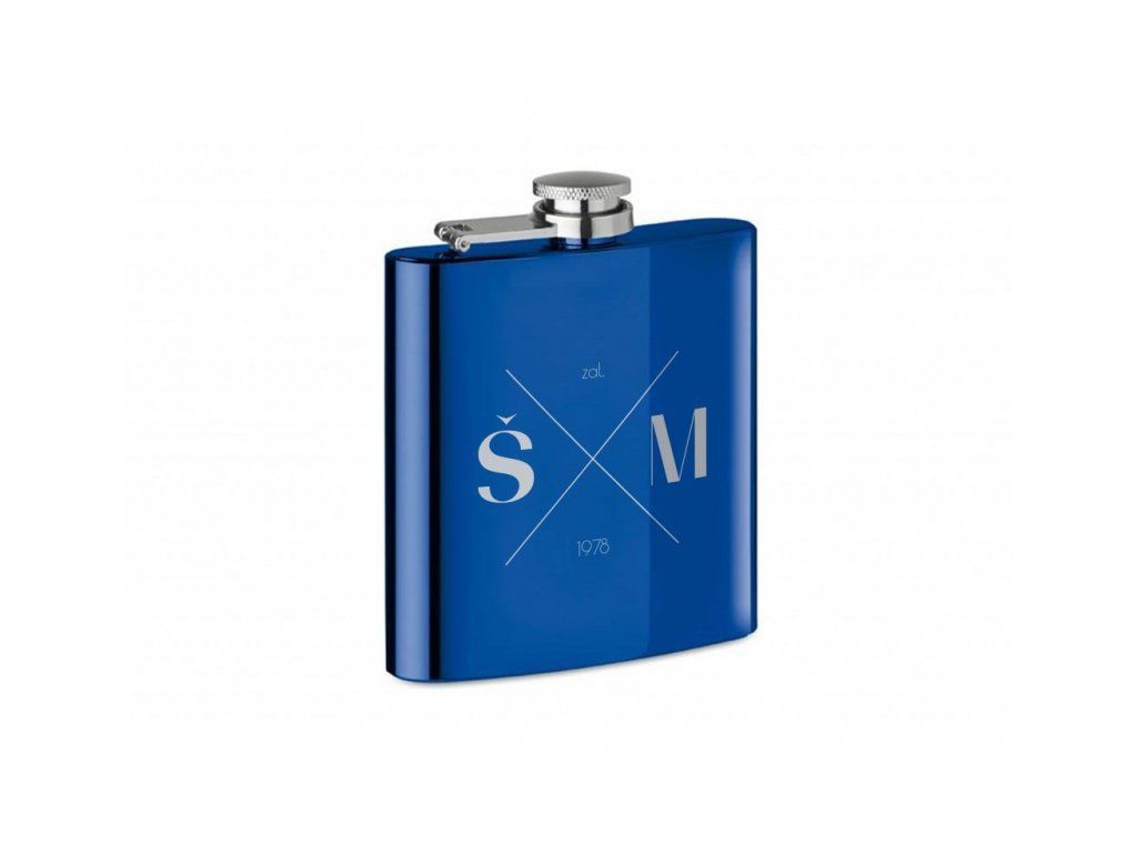 Originální modrá placatka s gravírováním vašich iniciálů či iniciálů obdarovaného.