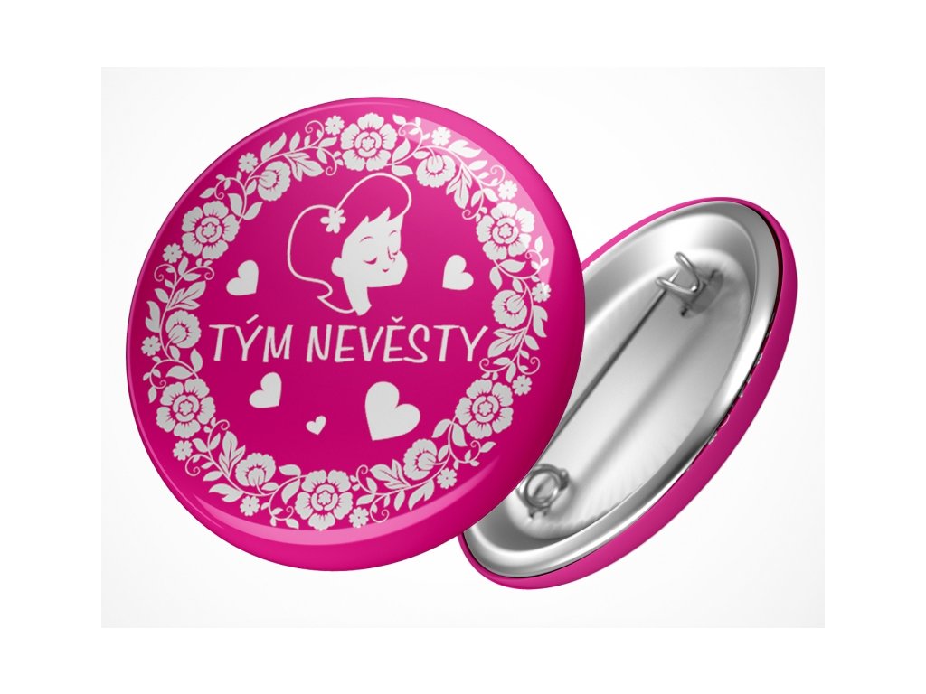Sytě růžový podklad je doplněn jemným květinovým ornamentem, romantickými srdíčky a stylizovaným motivem nevěsty. Design působí něžně, elegantně a zároveň výrazně, díky čemuž placka krásně vynikne na oblečení i doplňcích. Lesklý povrch zvýrazňuje barvy i drobné detaily potisku.