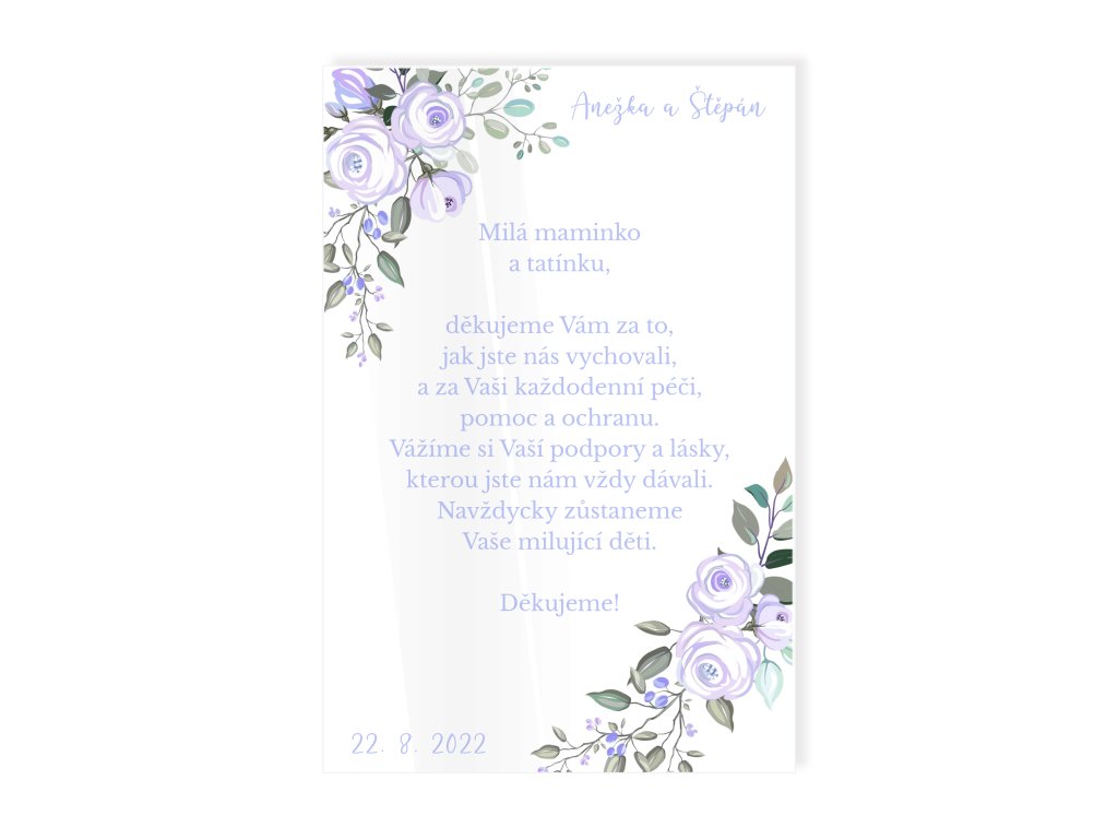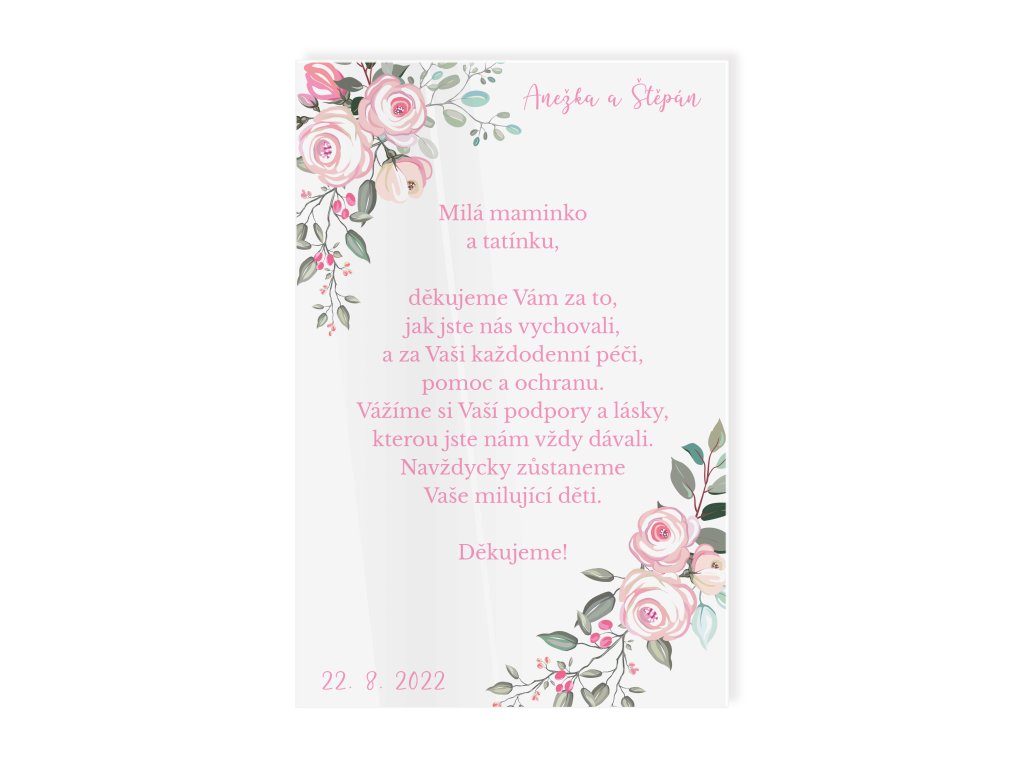 Poděkování rodičům patří k nejsilnějším okamžikům svatebního dne. Toto plexi poděkování je elegantní a citlivou formou, jak vyjádřit vděčnost za lásku, péči a podporu, kterou vám rodiče po celý život dávali.