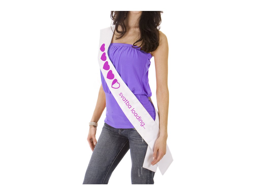 Čistý bílý podklad doplňuje hravý nápis „Svatba loading…“ a růžová srdíčka připomínající načítání nové životní kapitoly. Design působí moderně, vesele a velmi fotogenicky, díky čemuž šerpa okamžitě přitáhne pozornost a rozesměje celou party.