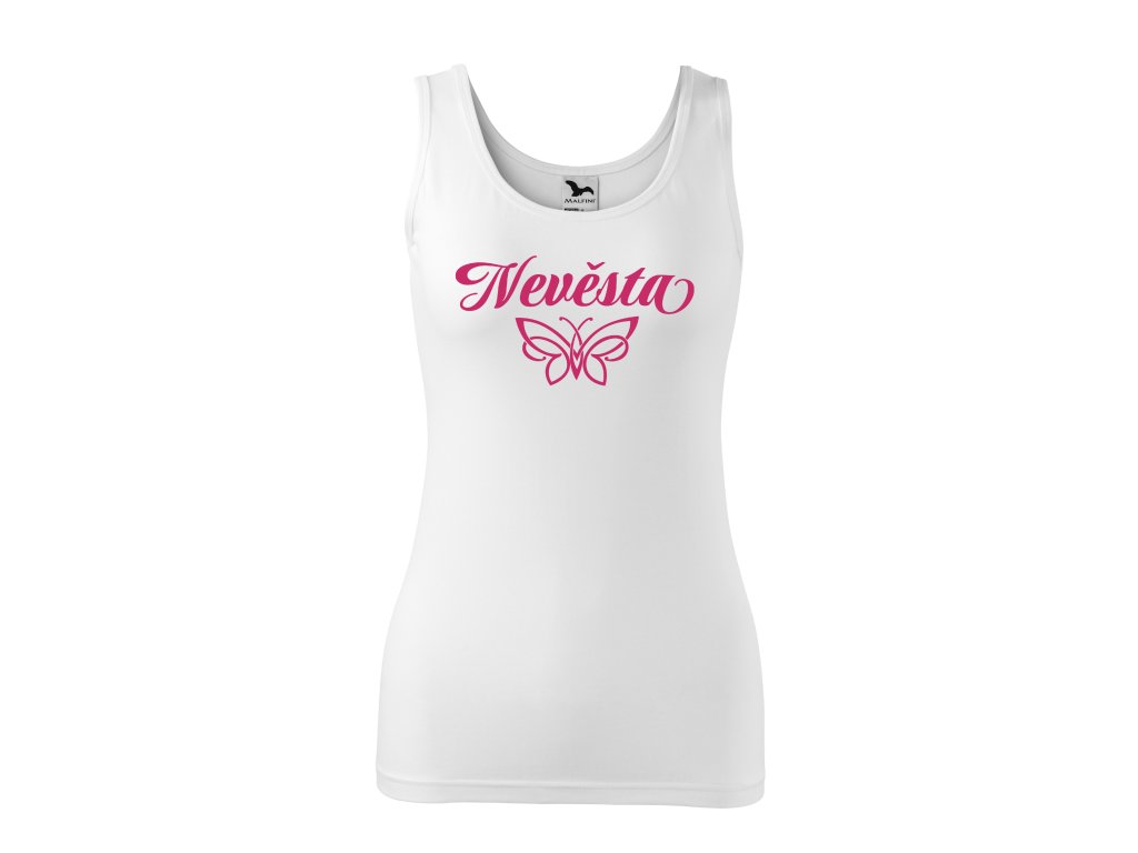 Jednoduchý a elegantní design doplňuje výrazný nápis „Nevěsta“ a jemný motiv motýlka. Celek působí žensky, romanticky a velmi vkusně, díky čemuž se tílko hodí jak ke kalhotám, tak k sukni nebo kraťasům. Skvěle vynikne také na společných fotografiích.