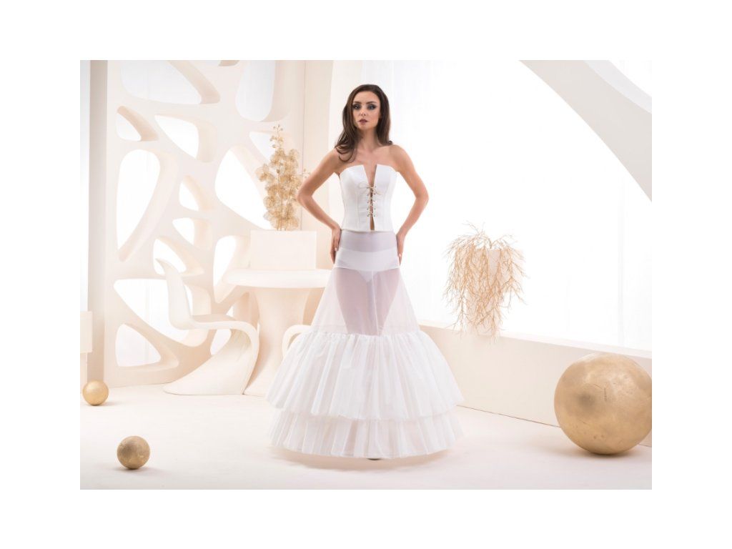Dvoukruhová spodnička s elastickým pásem se dvěma kruhy a dvěma volány. Obvod spodního kruhu je 220 cm, 270 cm nebo 320 cm.