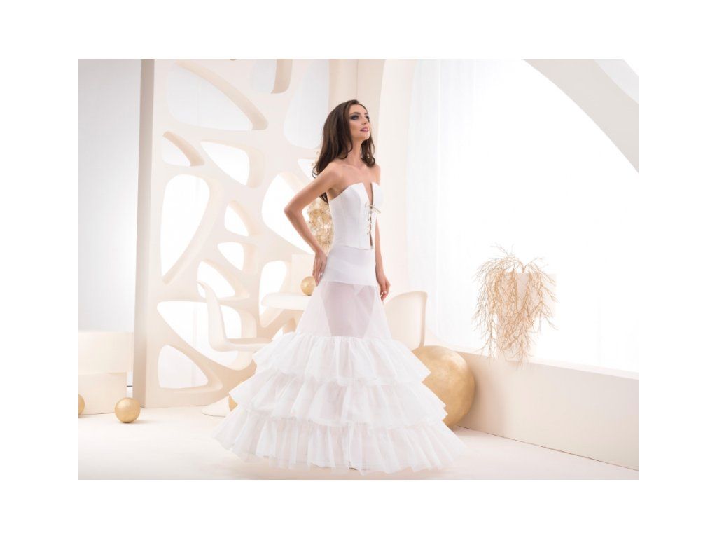 Spodnice s elastickým pásem se třemi kruhy a třemi volány. Vhodná pod velké sukně šatů a pro typy šatů, které jsou zůžené přes boky. Obvod spodního kruhu je 270 cm.