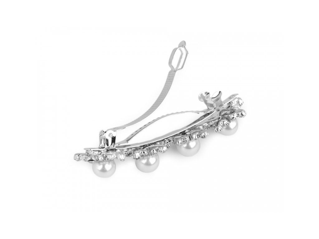 Francouzská štrasová spona s perlami luxusně ozdobí slavnostní účes. Má velmi kvalitní celokovové provedení. Zacvakávací mechanismus je pevný. Spona je zdobená voskovanými perlami a broušenými kamínky, které se oslnivě třpytí.Doplňkové parametry