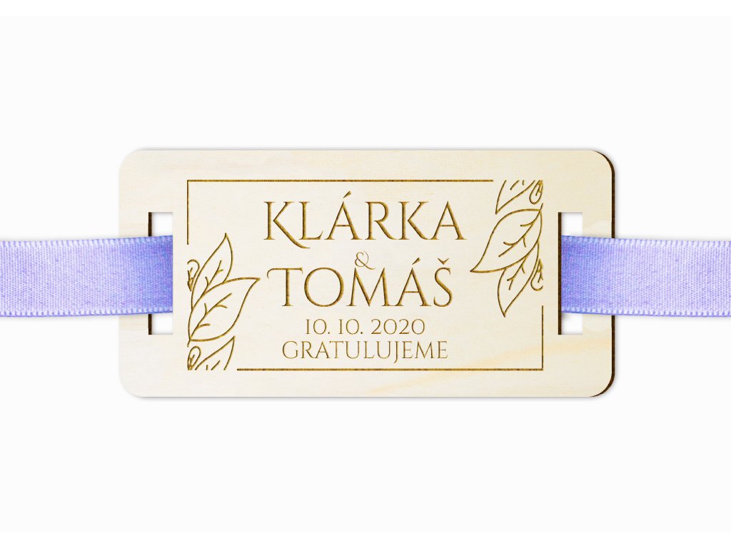 Cedulka je vyrobena z kvalitní topolové překližky s hladkým povrchem a jemnou kresbou dřeva. Text, jména i dekorativní motivy jsou pečlivě vypálené, takže působí elegantně a zároveň přirozeně. Průřezy po stranách umožňují snadné provlečení stuhy a pevné uchycení na dárku.