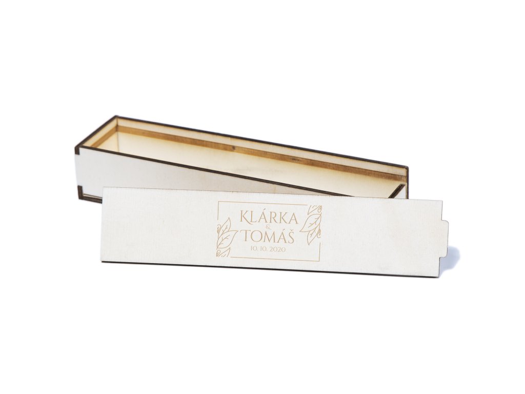 Krabička je vyrobena z kvalitního topolu, který vyniká světlým přírodním vzhledem a jemnou strukturou. Na víku se nachází precizní laserové gravírování se jmény novomanželů a datem svatby, doplněné decentním svatebním motivem. Díky čistému designu působí krabička elegantně a stane se trvalou památkou na svatební den.