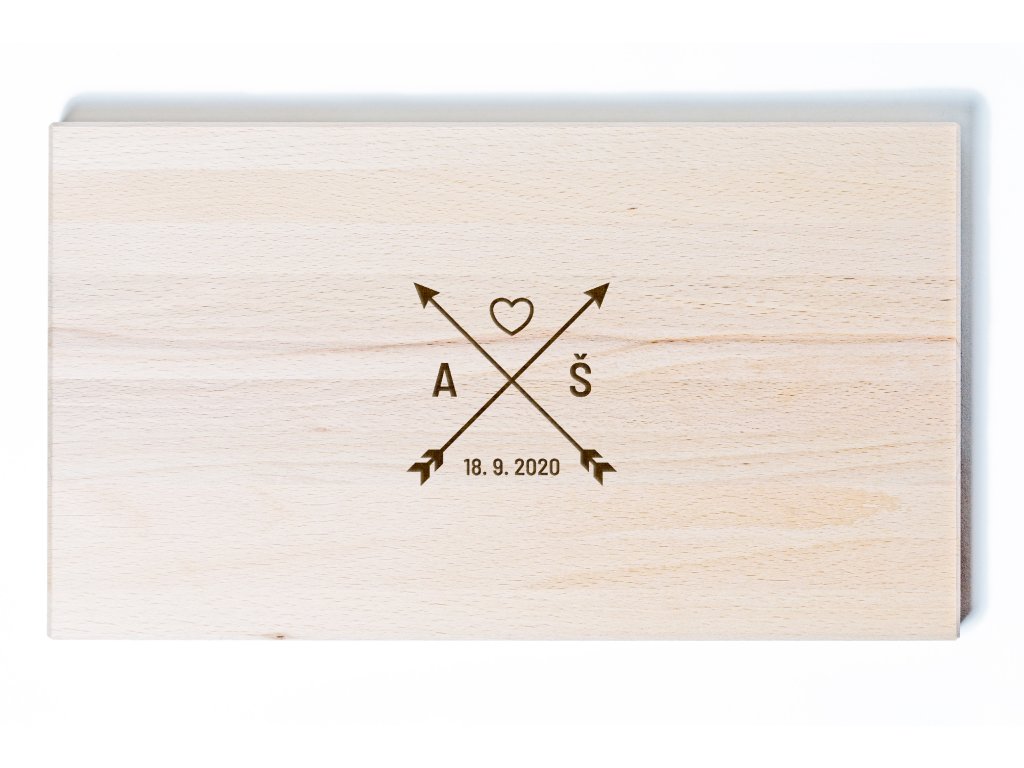 Toto svatební dřevěné prkénko s iniciálami je jednoduchým, ale velmi osobním dárkem pro novomanžele. Symbol zkřížených šípů se srdcem vyjadřuje lásku, jednotu a společnou cestu životem.