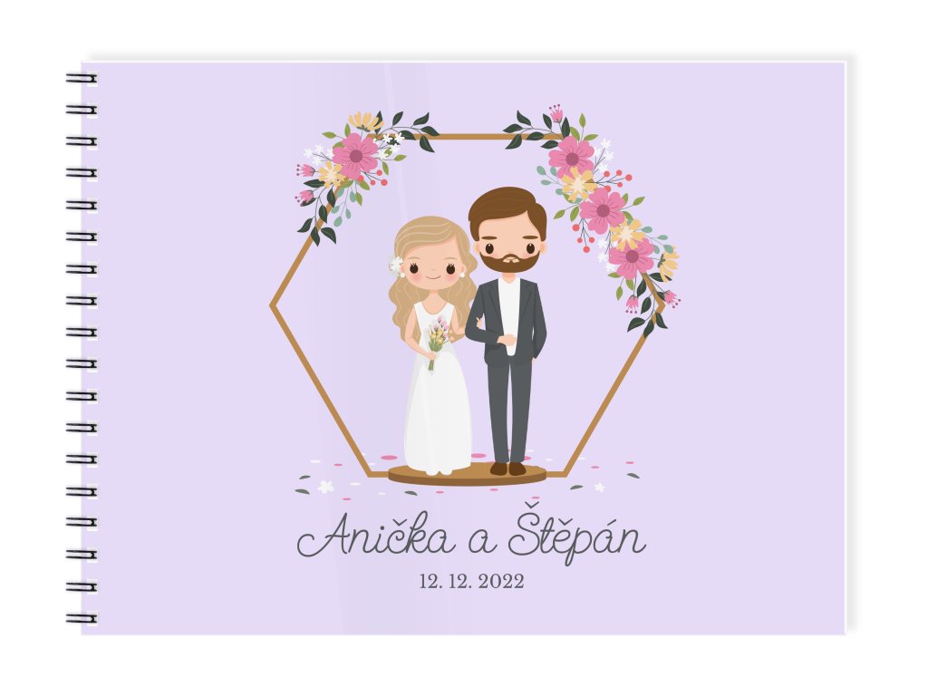 Album zdobí roztomilá ilustrace nevěsty a ženicha zasazená do geometrického květinového rámu. Celkový design je doplněn o jména novomanželů a datum svatby. Plexi desky dodávají albu moderní vzhled a krásně zvýrazňují barevný motiv.