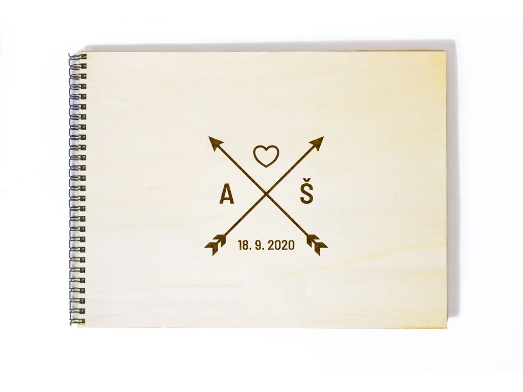 Titulní stranu zdobí elegantní motiv zkřížených šípů se srdcem, doplněný iniciálami a datem svatby. Přírodní provedení alba působí jemně, nadčasově a nechává vyniknout samotný význam symbolu.