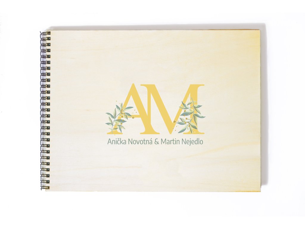 Album zdobí dominantní zlaté iniciály novomanželů, doplněné jemným botanickým motivem a personalizovanými jmény. Přírodní dřevěný podklad dodává albu lehkost a nadčasový charakter, díky kterému zapadne do moderního i klasického stylu svatby.