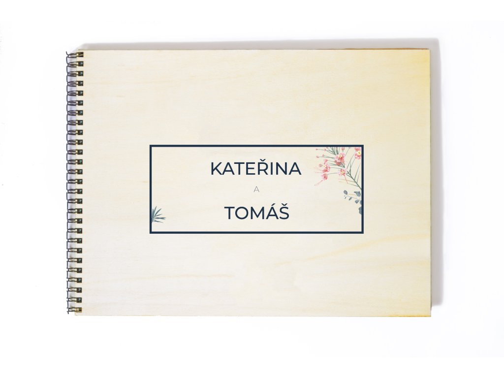 Album zdobí decentní obdélníkový rámeček s jemným květinovým motivem, ve kterém jsou umístěna jména novomanželů. Světlý přírodní podklad působí nadčasově a elegantně, díky čemuž se album hodí ke klasickým, venkovním i moderním svatbám.