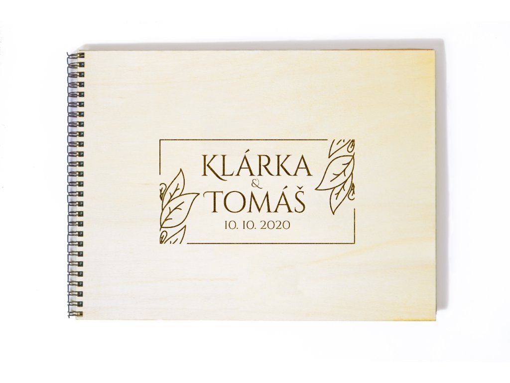 Album zdobí čistý obdélníkový rámeček doplněný o decentní listové motivy v rozích. Jména novomanželů a datum svatby jsou umístěny do středu designu, který působí klidně, vyváženě a nadčasově. Světlý přírodní podklad se hodí ke klasickým, moderním i přírodním svatbám.