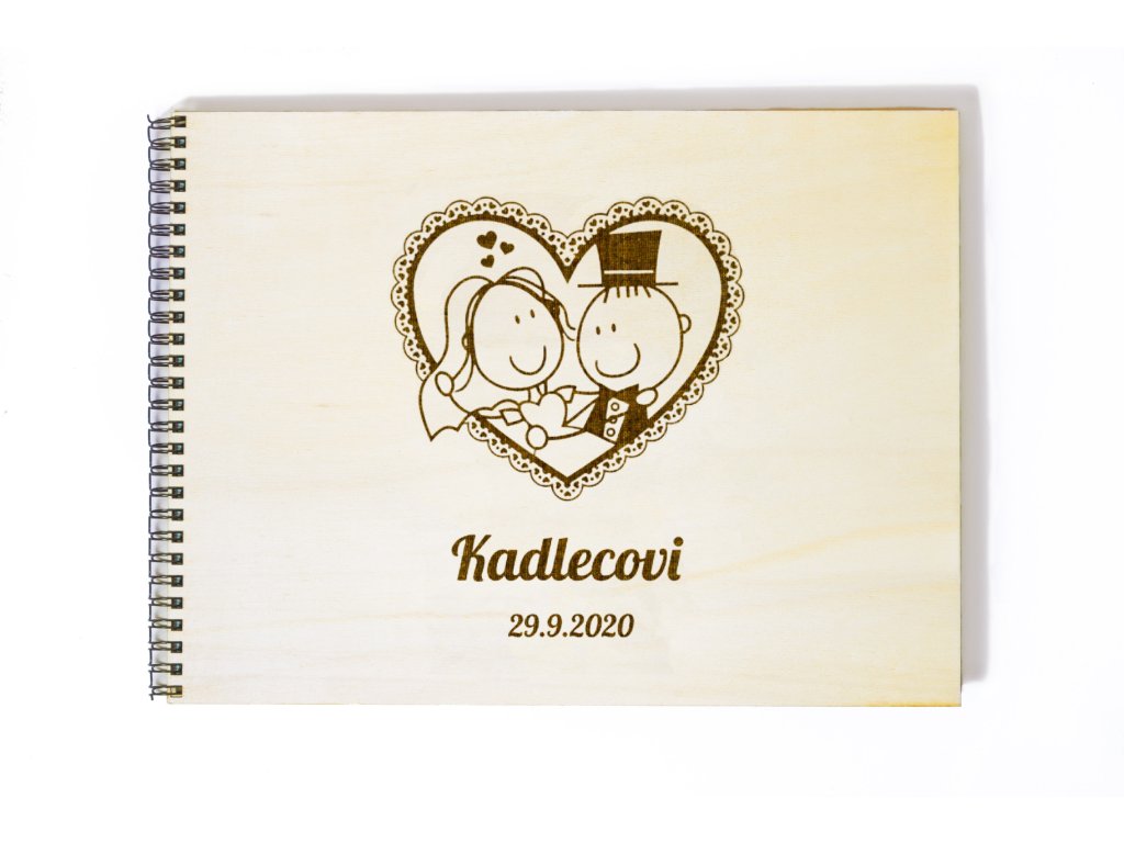 Titulní stranu zdobí jemná ilustrace nevěsty a ženicha v krajkovém srdci, doplněná o příjmení novomanželů a datum svatby. Přírodní světlý podklad v kombinaci s decentním gravírováním vytváří harmonický a elegantní celek, který se hodí ke klasickým i romanticky laděným svatbám.