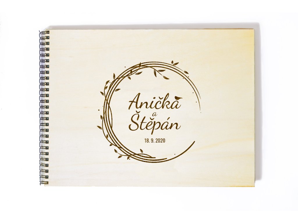 Svatební fotoalbum s kruhovým věnečkem a jmény