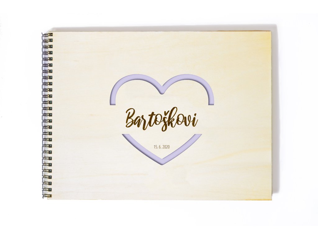Dominantním prvkem alba je jemné obrysové srdce, uvnitř kterého je elegantně umístěno příjmení novomanželů a datum svatby. Světlý přírodní podklad dodává albu lehkost, čistotu a nadčasový vzhled, který se hodí ke každému svatebnímu stylu.