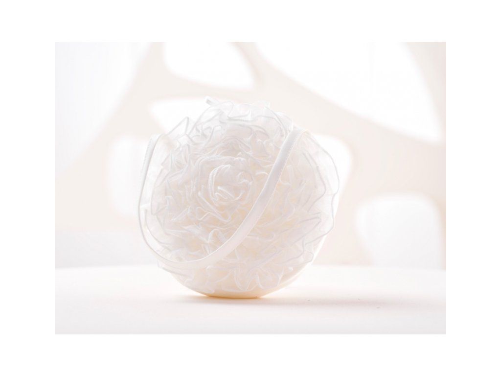 Svatební saténová kabelka s oušky. Průměr kabelky je 15 cm.