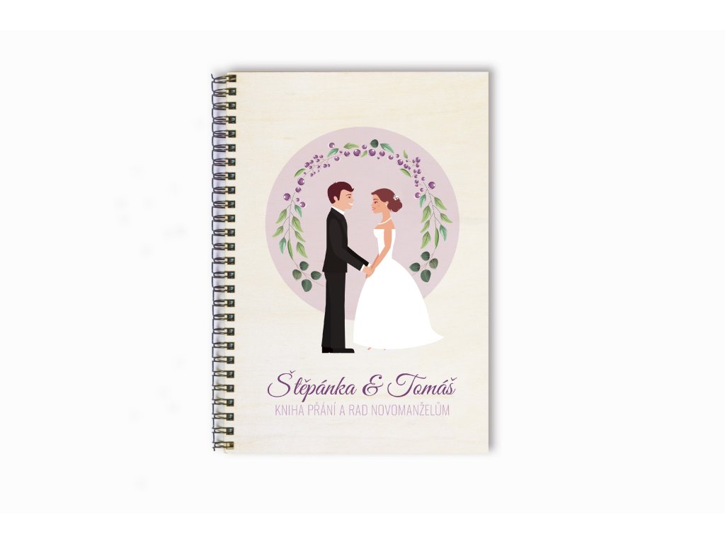 Obálku zdobí něžná ilustrace novomanželů v romantickém kruhovém motivu s květinami. Celkový vzhled působí jemně, elegantně a harmonicky, díky čemuž se kniha hodí ke klasickým, přírodním i moderním svatbám. Spirálová vazba zajišťuje pohodlné listování a praktické používání.