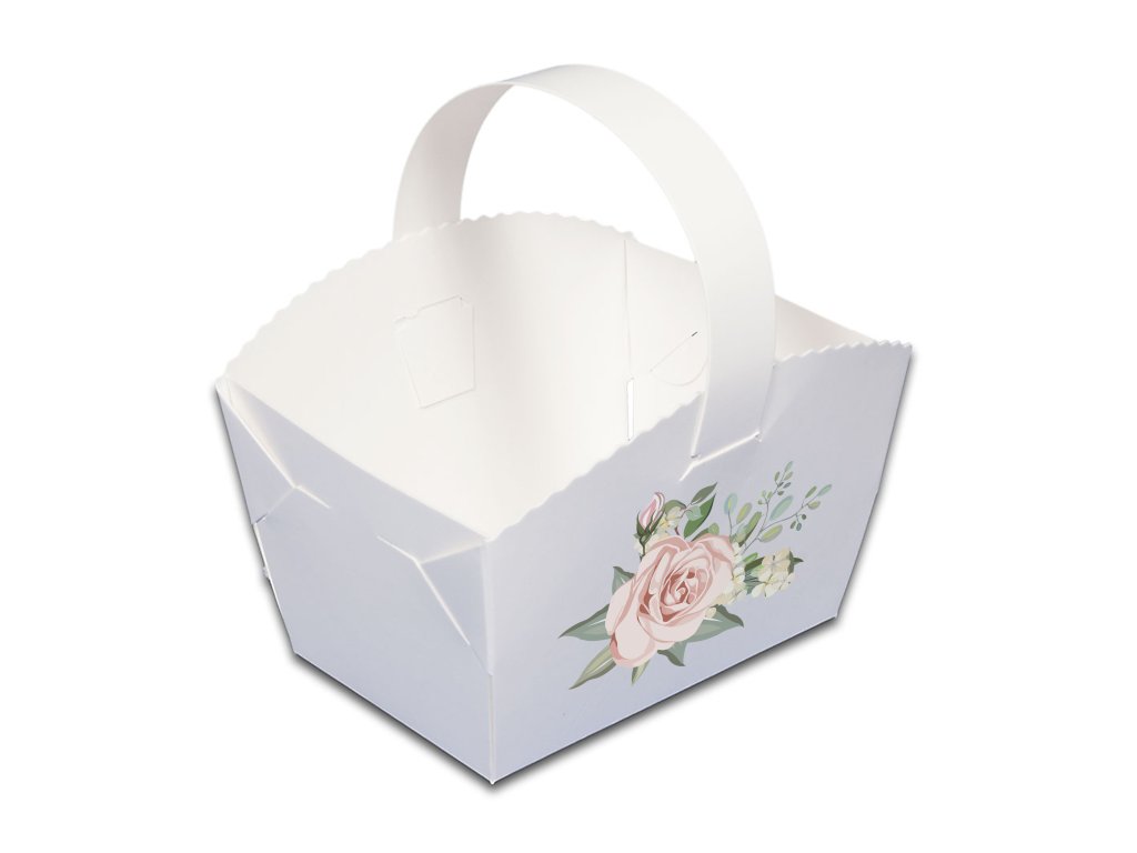 Tento svatební košíček je ideální pro tradiční koláčky, cukroví nebo drobnou sladkou výslužku. Jemný květinový motiv krásně zapadne do romantického i přírodního svatebního stylu.