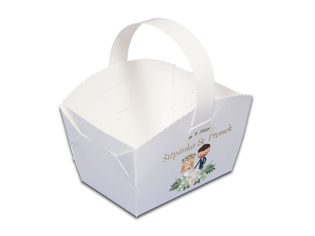 Košíček lze upravit jmény novomanželů a datem svatby. Ilustrace ženicha a nevěsty vytváří osobní detail, díky kterému se z košíčku stane milá památka na váš svatební den.