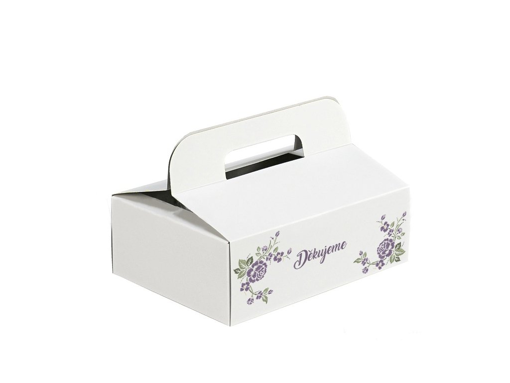 Svatební výslužka s decentním nápisem „Děkujeme“ je milým gestem, které hosté ocení. Krabička působí elegantně a zároveň krásně doplní svatební tabuli.
