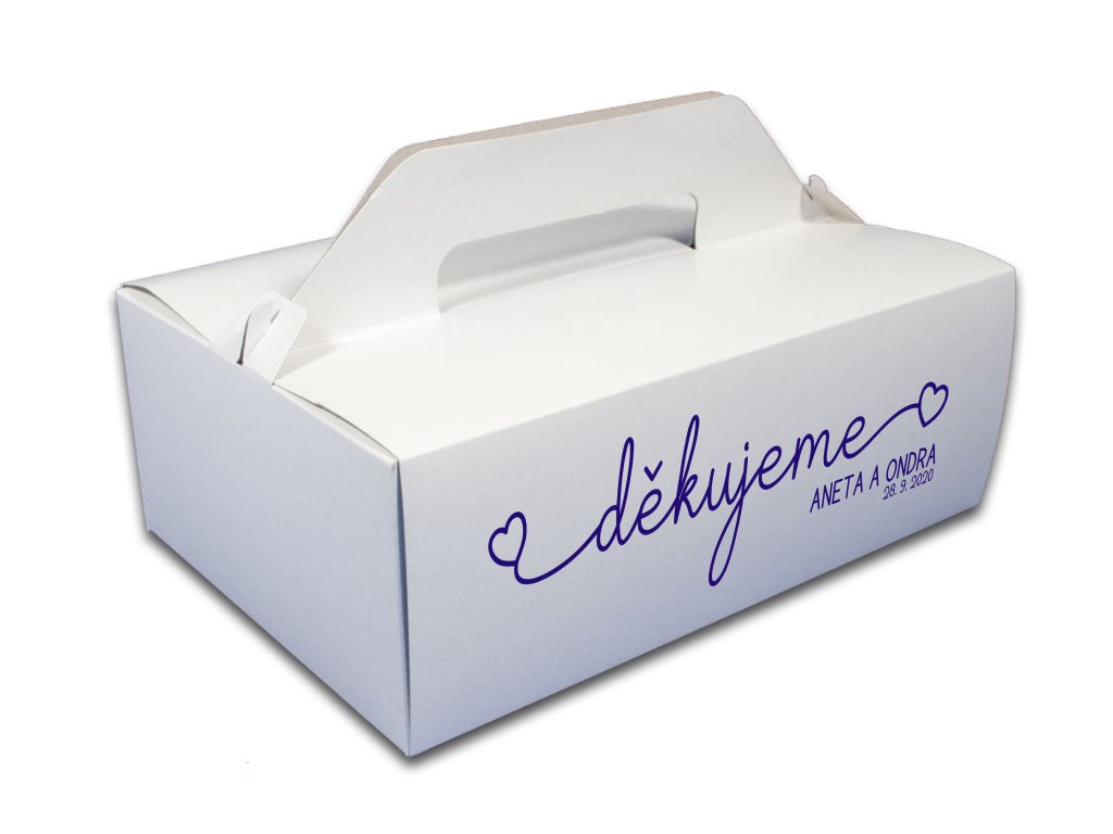 Svatební krabička na výslužku s uchem – „Děkujeme srdcem“ (se jmény a datem)