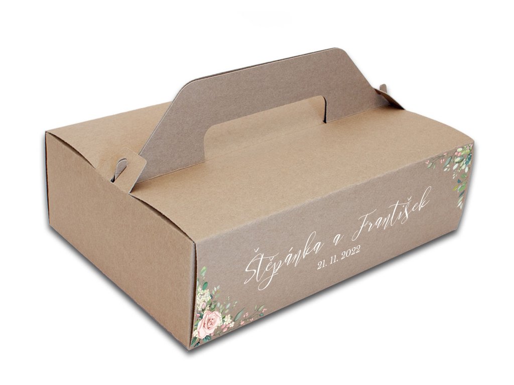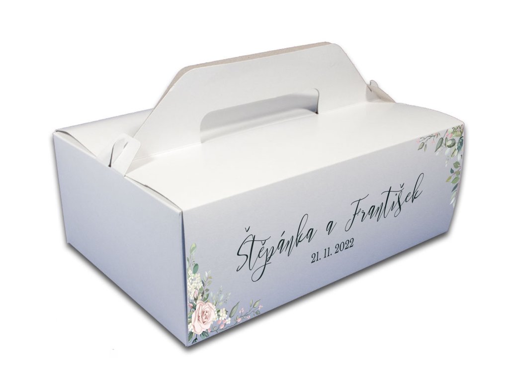 Svatební krabička na výslužky – květinový motiv se jmény