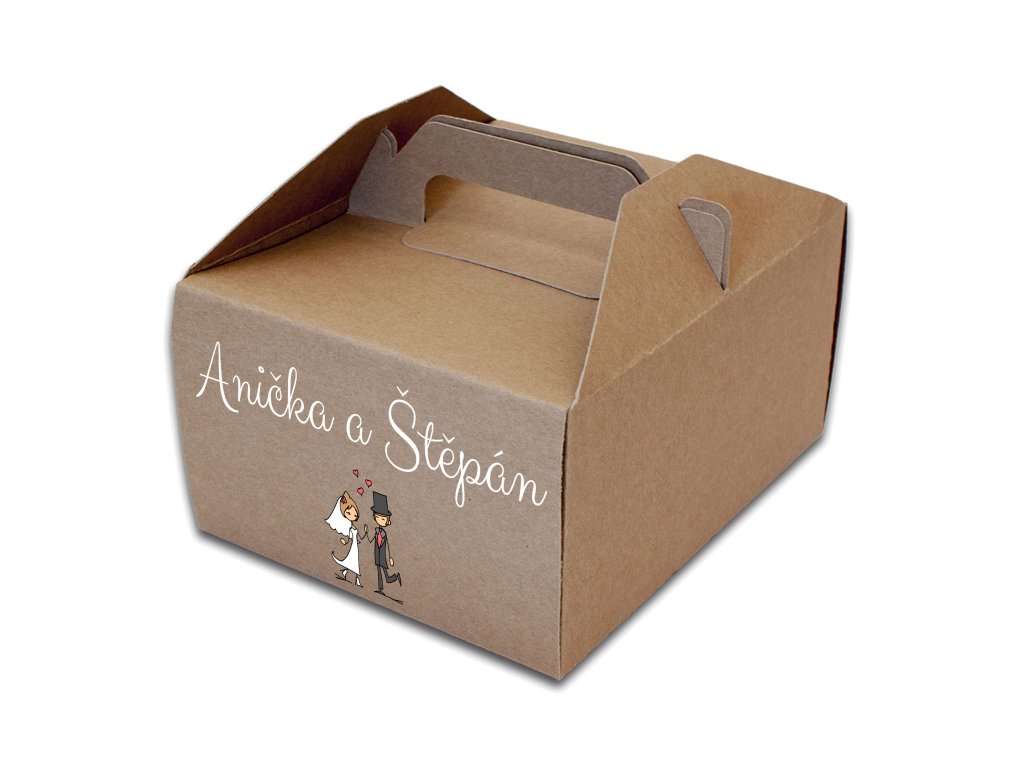 Svatební výslužka nemusí být jen obyčejná krabička. Díky ilustraci novomanželů a personalizovaným jménům se z ní stane milá památka, kterou si hosté rádi odnesou domů.