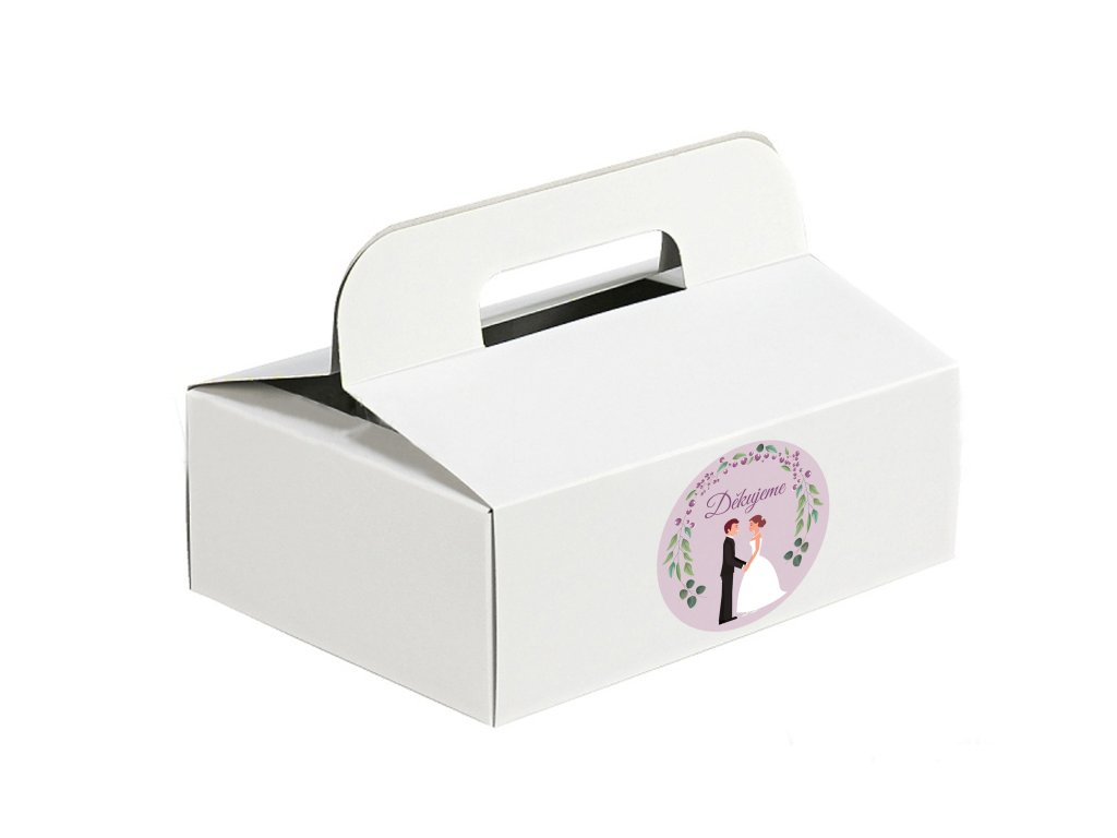 Stylová svatební krabička s uchem a motivem „Děkujeme“ je krásným a praktickým způsobem, jak poděkovat svatebním hostům za jejich účast na vašem velkém dni. Skvěle poslouží na výslužku, sladkosti nebo drobné dárky a zároveň bude elegantním doplňkem svatební tabule.