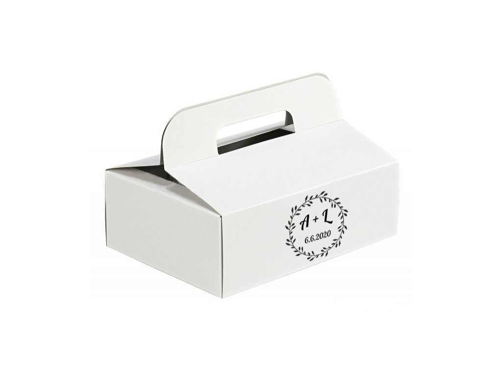 Minimalistická svatební krabička s uchem a jemným motivem věnečku s iniciálami novomanželů a datem svatby je elegantním a nadčasovým doplňkem svatební tabule. Krásně poslouží jako poděkování svatebním hostům a milá památka na váš velký den.