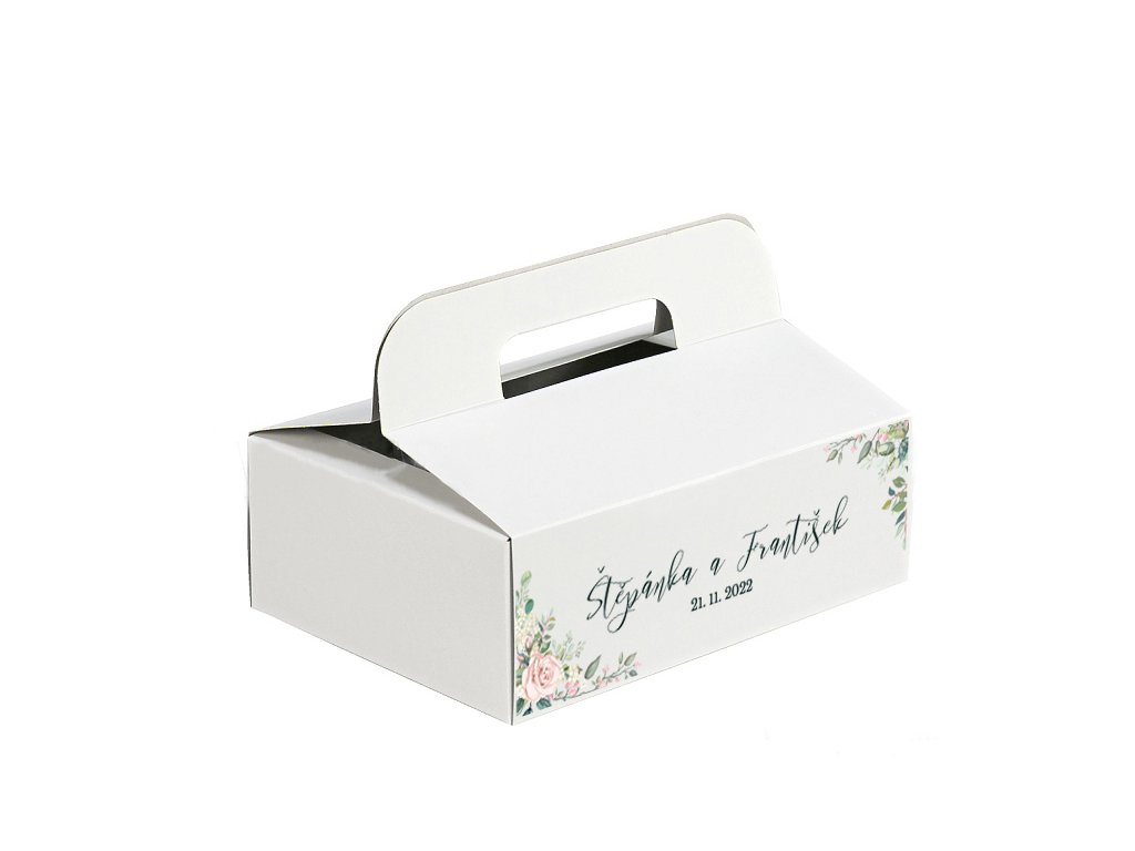Svatební krabička s uchem a jemným květinovým motivem, jmény novomanželů a datem svatby je elegantním a praktickým doplňkem svatební tabule. Krásně poslouží jako poděkování svatebním hostům i jako milá památka na váš velký den.