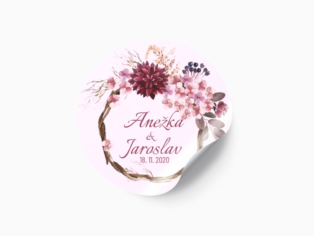 Svatební nálepky jsou drobným detailem, který udělá velký dojem. Jemný květinový věnec v romantických tónech dodá Vaší svatbě něžnou a elegantní atmosféru a krásně sjednotí svatební výslužky i dekorace.