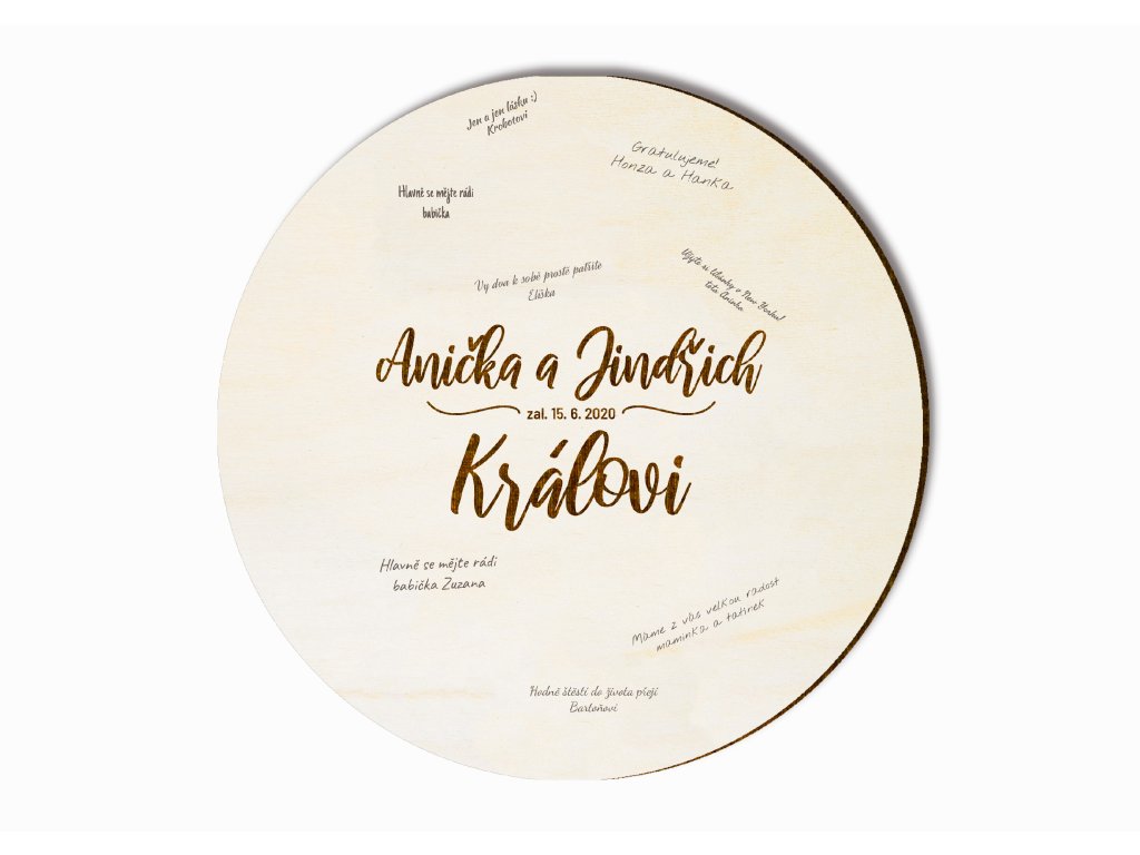 Tento kulatý svatební obraz s vzkazy hostů je krásnou a osobní alternativou ke klasické knize hostů. Každý svatební host může na obraz napsat své přání, podpis nebo krátký vzkaz novomanželům a společně tak vytvoří jedinečnou památku plnou emocí. Po svatbě se z něj stane stylová dekorace vašeho domova.