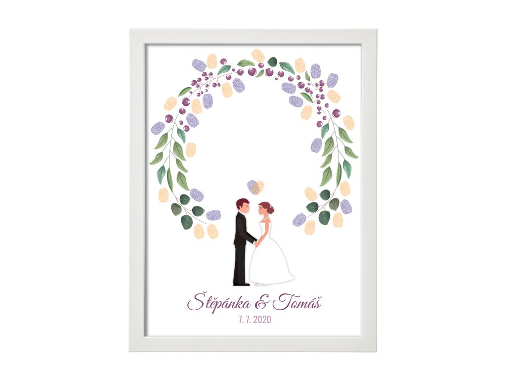 Tento svatební obraz s květinovým věncem na otisky prstů je jemnou a romantickou alternativou ke klasické knize hostů. Každý svatební host zanechá svůj barevný otisk prstu do věnce a společně tak vytvoří originální obraz plný vzpomínek. Po svatbě se z něj stane krásná dekorace vašeho domova.