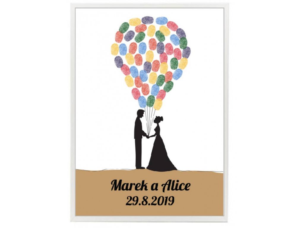 Tento svatební obraz s balónky na otisky prstů je hravou a zároveň romantickou alternativou ke klasické knize hostů. Každý host zanechá svůj otisk prstu jako jeden z barevných balónků a společně tak vytvoří jedinečný obraz plný radosti, lásky a vzpomínek. Po svatbě se z něj stane krásná dekorace vašeho domova.