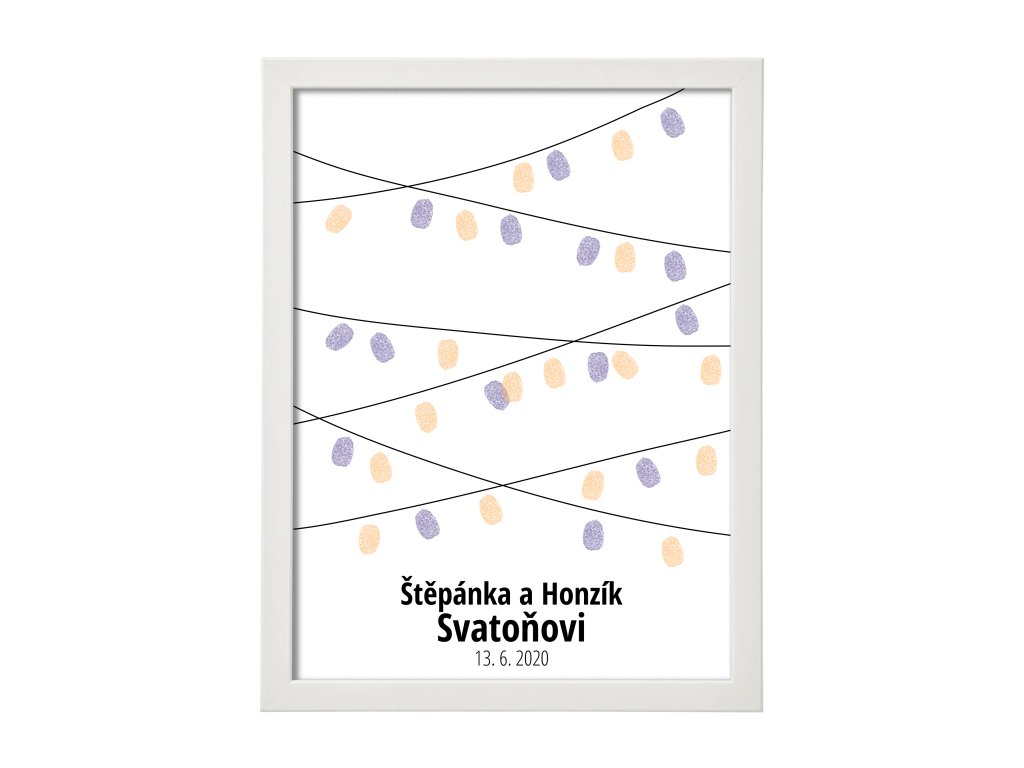 Tento svatební obraz s girlandami na otisky prstů je moderní a hravou alternativou ke klasické knize hostů. Každý svatební host zanechá svůj otisk prstu na jednu z girland a společně tak vytvoří originální obraz plný vzpomínek. Po svatbě se z něj stane krásná dekorace vašeho domova.