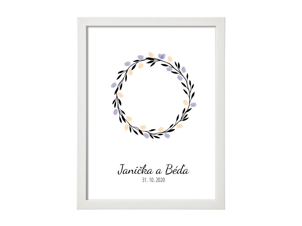 Tento svatební obraz s věnečkem na otisky prstů je elegantní a nadčasovou alternativou ke klasické knize hostů. Každý svatební host zanechá svůj otisk prstu do jemného věnečku a společně tak vytvoří originální obraz plný vzpomínek. Po svatbě se z něj stane krásná dekorace vašeho domova.