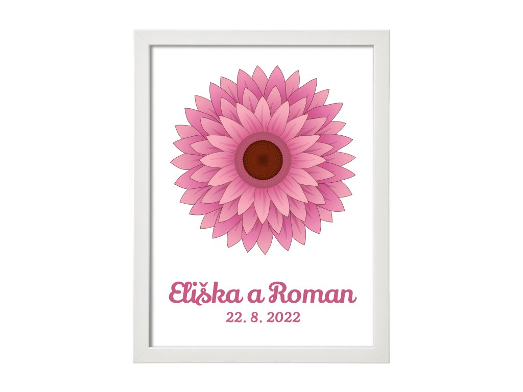 Tento svatební obraz s motivem růžové gerbery je jemnou a elegantní alternativou ke klasické knize hostů. Svatební hosté zanechávají své otisky prstů přímo na okvětní lístky gerbery, čímž společně vytvářejí originální květ plný vzpomínek. Po svatbě se obraz stane krásnou dekorací vašeho domova.