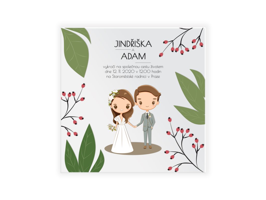 Oznámení upravíme přesně podle vašich přání. Samozřejmostí je změna jmen, data, času i místa obřadu. Na přání lze upravit také vzhled ilustrace – barvu vlasů nevěsty i ženicha, účes, vousy u ženicha nebo drobné detaily, aby postavičky co nejvíce odpovídaly skutečnosti.