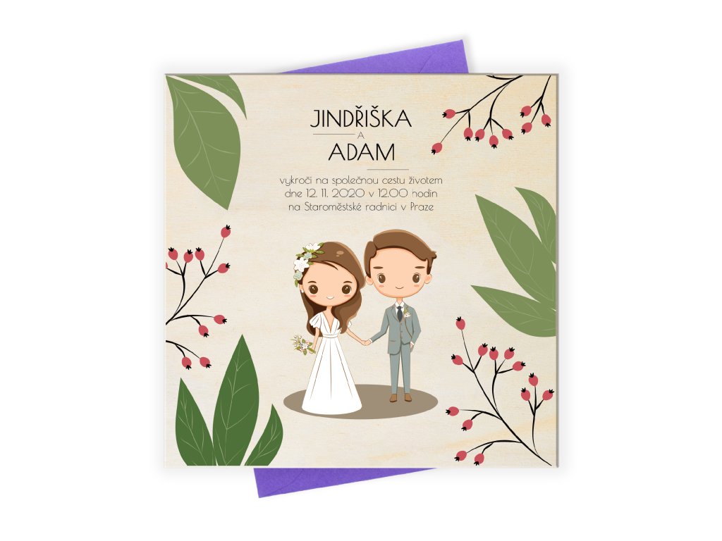 Toto dřevěné svatební oznámení je skvělou volbou pro svatby laděné do přírodního, romantického nebo boho stylu. Ilustrace novomanželů v kombinaci s jemnými listy působí mile, přátelsky a navodí příjemnou atmosféru už při prvním pohledu.