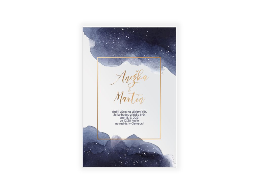 Akvarelový motiv inspirovaný noční oblohou symbolizuje klid, nekonečno a nový společný začátek. Průhledné plexisklo dodává oznámení moderní eleganci a zlatý rámeček celý design krásně sjednocuje.