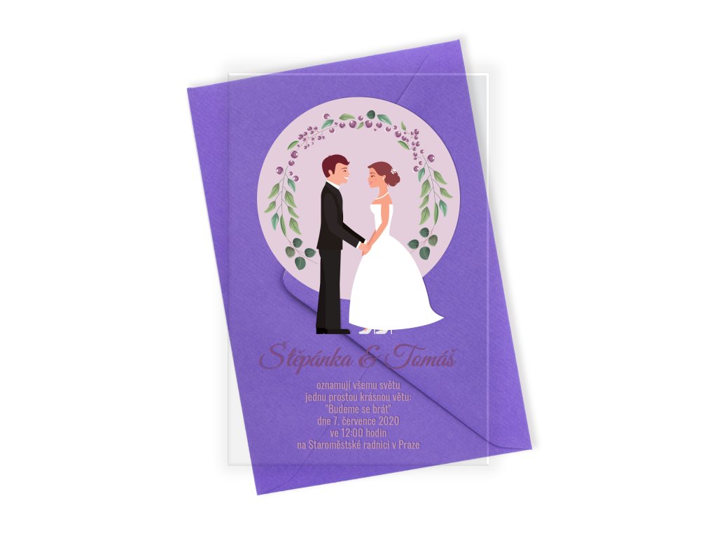 Svatební oznámení z plexiskla – ilustrace novomanželů v kruhu