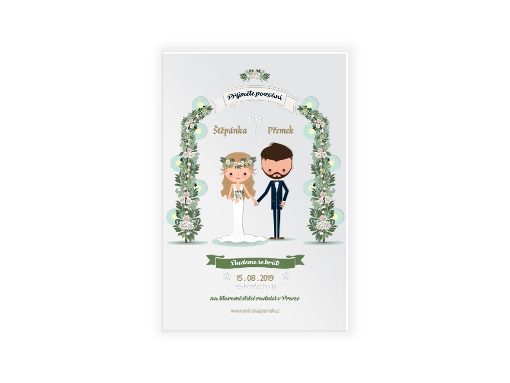 Svatební oznámení z plexiskla s ilustrací páru – květinový oblouk