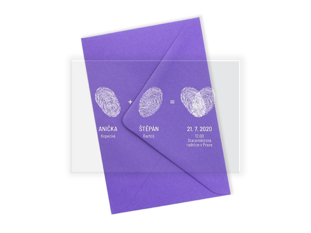 Svatební oznámení z průhledného plexiskla s motivem otisků prstů je krásným symbolem spojení dvou jedinečných osobností v jeden celek. Minimalistické zpracování působí moderně, čistě a velmi elegantně, díky čemuž oznámení zaujme hned na první pohled.