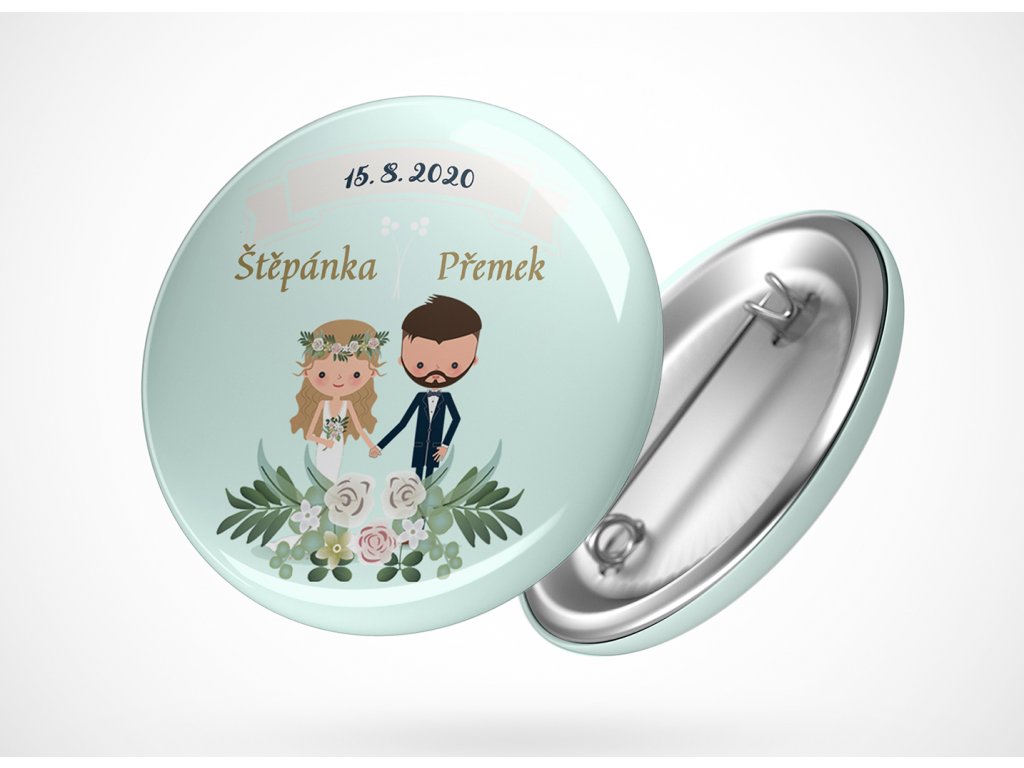 Ilustrovaný motiv nevěsty a ženicha působí mile, hravě a přátelsky. Tato svatební placka je ideální volbou pro páry, které chtějí svatební doplňky s osobitým stylem a jemnou dávkou humoru. Skvěle zapadne do romantických i rodinně laděných svateb.