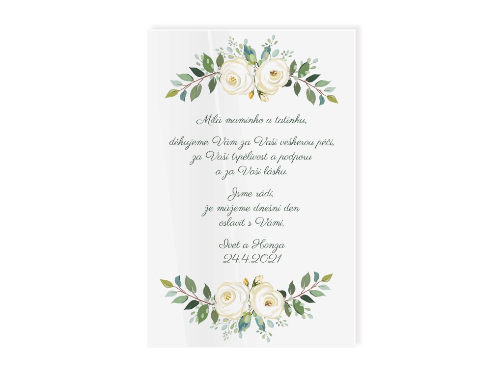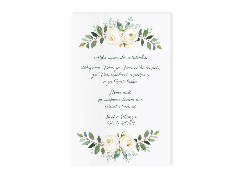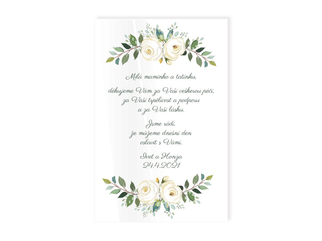 Svatební poděkování rodičům patří k nejdojemnějším momentům celého dne. Jemný květinový motiv v kombinaci s osobním textem vytváří krásnou vzpomínku, která rodičům připomene vaši vděčnost a lásku.