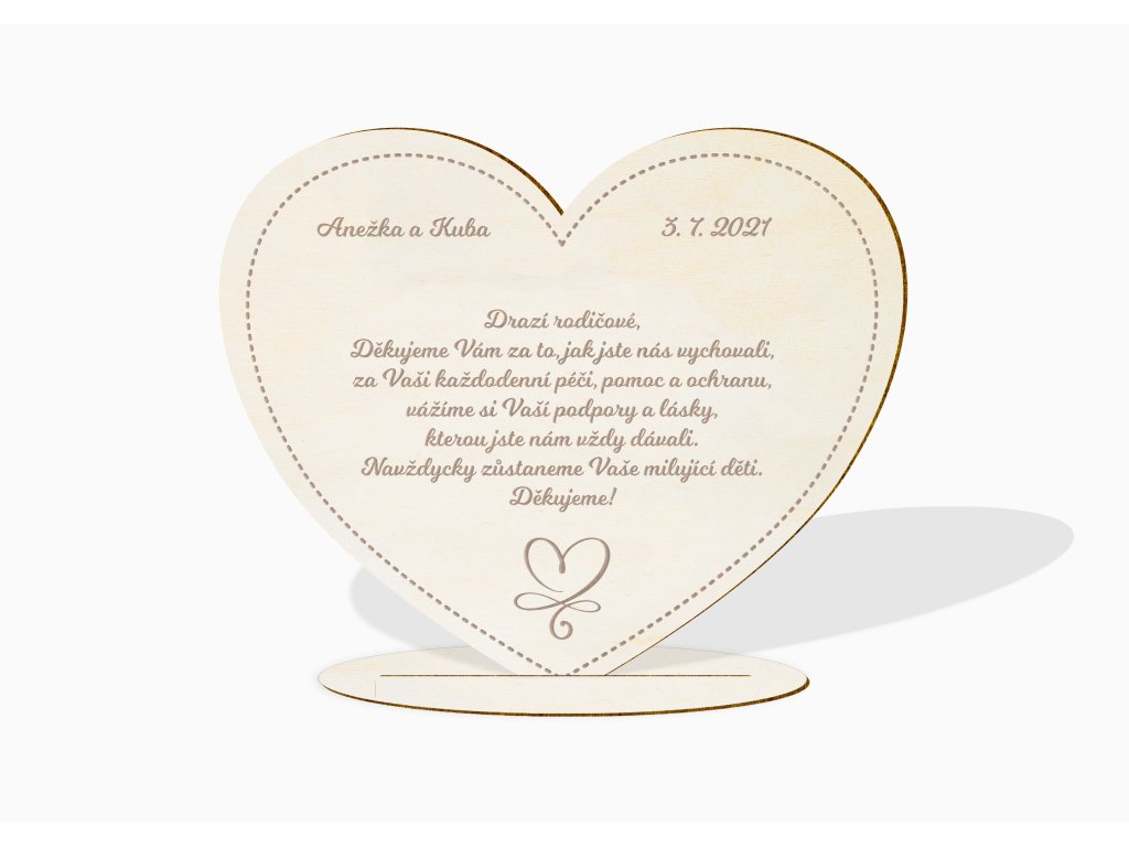 Srdce lze upravit na míru – doplnit jména novomanželů, datum svatby nebo vlastní text poděkování. Vznikne tak jedinečný dárek, který rodiče potěší a uchovají si jej jako památku na váš den.