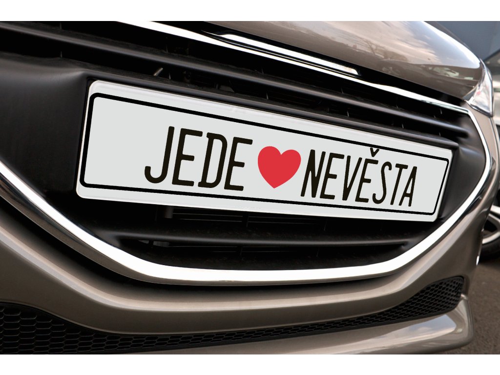 Svatební SPZ s nápisem „Jede nevěsta“ a výrazným červeným srdcem je krásným detailem, který ozdobí auto při cestě na obřad. Jemný, ale dobře čitelný motiv jasně dává najevo, že právě přijíždí nevěsta.