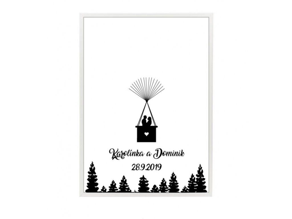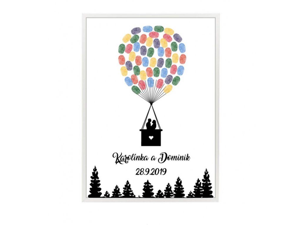 Svatební "strom" v s motivem horkovzdušného balónu určený k natisknutí otisků hostů s podpisem. Strom je dodávaný v bílém rámu a je určen pro 50 - 80 otisků prstů.