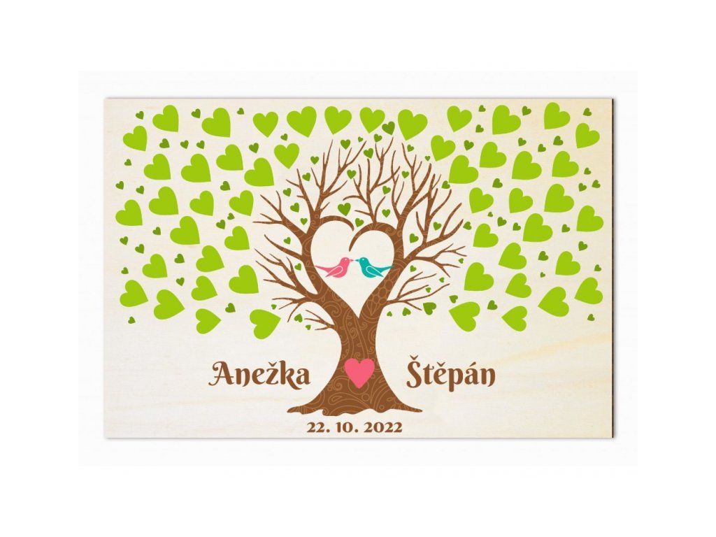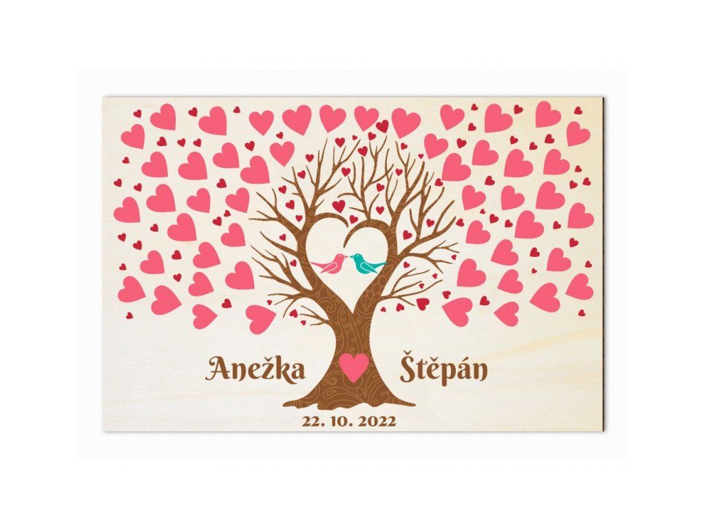 Dřevěný svatební strom s barevným potiskem a Vašimi jmény a datem svatby. Celkem je na obraze 50 srdíček pro podpis a můžete vybírat z jejich několika barevných variant.